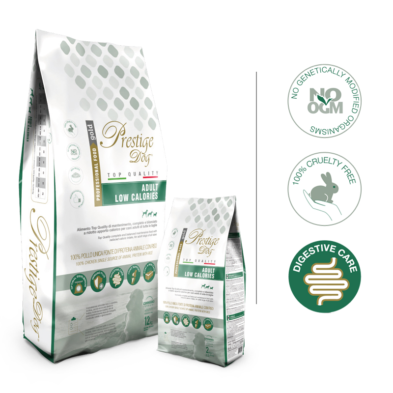 PRESTIGE DOG ADULT ALL BREEDS LOW CALORIES POLLO CON RISO è un alimento di alta qualità completo e bilanciato per cani adulti di tutte le taglie. Formulato con il pollo quale unica fonte di proteina animale altamente digeribile, apporta un contenuto ridotto di calorie e per questo è perfetto per mantenere il cane in salute, specialmente i soggetti adulti con vita sedentaria e con tendenza al sovrappeso. Arricchito con una quantità superiore di L-carnitina, che è nota per favorire la movimentazione dei grassi e quindi il loro consumo. I livelli di proteine e grassi sono bilanciati per rispondere ai dei cani di tutte le taglie.